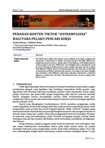 Rozzy, Fachrul and Rozy, Fakhrur (2024) Peranan Konten Tiktok "@Vinamuliana" bagi Para Pelaku Pencari Kerja. eScience Humanity Journal, 4 (2). pp. 242-250. ISSN 2747-1926
