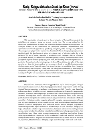 Nasution, Ammar Huzein and Adnir, Farid (2024) Analisis terhadap Hadist tentang Larangan Anak Keluar Waktu Malam Hari. RESLAJ: Religion Education Social Laa Roiba Journal, 6 (5). pp. 3134-3146. ISSN 2656-4691