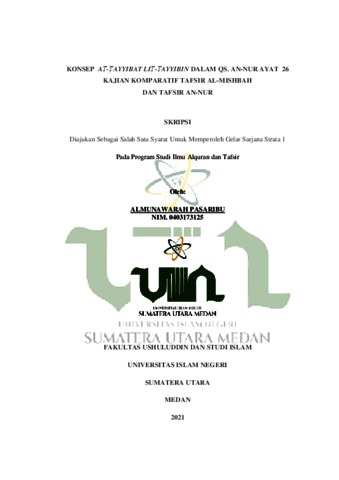 Pasaribu, Almunawarah (2021) Konsep Aṭ-Ṭayyibat Liṭ-Ṭayyibin dalam QS. An-Nur Ayat 26 Kajian Komparatif Tafsir Al-Mishbah dan Tafsir An-Nur. Skripsi thesis, Universitas Islam Negeri Sumatera Utara Medan.