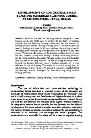 Zunidar, Zunidar (2022) Development Of Contextual-Based Teaching Materials Planning Course At UIN Sumatera Utara, Medan. Didaktika Religia: Journal of Islamic Education, 10 (2). pp. 213-234. ISSN p-ISSN: 2337-7305; e-ISSN: 2549-631X