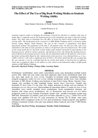 Zunidar, Zunidar (2022) The Effect of The Use of Big Book Writing Media on Students Writing Ability. Edukasi Islami: Jurnal Pendidikan Islam, 11 (1). ISSN P-ISSN: 2614-4018 E-ISSN: 2614-8846