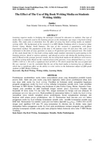 Learning requires media in bridging the messages conveyed by educators to students. One type of media that is commonly used in the learning process at the elementary age stage is big book writing media. This study aims to determine how the effect of using big book writing media on students' writing skills. The background of the research is at MIN Medan Tembung which is located at Jalan Pertiwi Ujung, Medan, North Sumatra. The type of this research is quantitative with Quasi Experiment method. The population of the data is 40 students (class VA and class VB), with a test instrument in the form of essay questions as many as 10 questions (pre-test and post-test). The results of this study found that (1) big book writing media made students interested in participating in the learning process, dared to express opinions, and played an active role during the learning process; and (2) Based on the average post-test results, the use of big book media on the ability to write stories has better writing skills. Based on the t statistical test in the post-test, it was obtained that tcount > ttable, 2.689> 2.024 (n = 20) with a significant level of 0.05 or 5% which stated that Ha was accepted and Ho was rejected, it can be concluded that the use of big book media in learning has an influence which has a significant effect on the ability to write stories in the Indonesian subject of fifth-grade students at MIN Medan Tembung