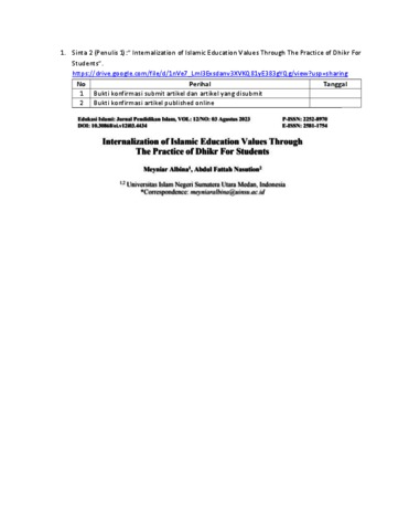 Albina, Meyniar and Nasution, Abdul Fattah (2023) Internalization Of Islamic Education Values Through The Practice Of Dhikr For Students. Edukasi Islami: Jurnal Pendidikan Islam, 12 (3). ISSN P-ISSN: 2252-8970 E-ISSN: 2581-1754