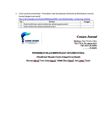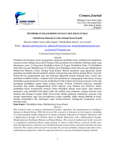 Albina, Meyniar and Siagian, Nurul Adha and Mazid, Miftah Ilham and Lestari, Ayu (2023) Pendidikan Islam Berwawasan Multikultural (Manifestasi Manusia Cerdas Sebagai Insan Kamil). Cemara Journal, 1 (4). ISSN 2987-4092