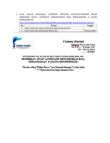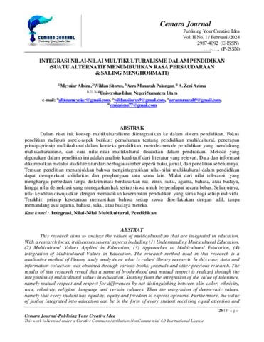 Albina, Meyniar and Sitorus, Wildan and Pulungan, Azra Munazah and Azima, A. Zeni (2024) Integrasi Nilai-Nilai Multikulturalisme Dalam Pendidikan (Suatu Alternatif Menumbuhkan Rasa Persaudaraan & Saling Menghormati). Cemara Journal, 11 (1). ISSN 2987-4092