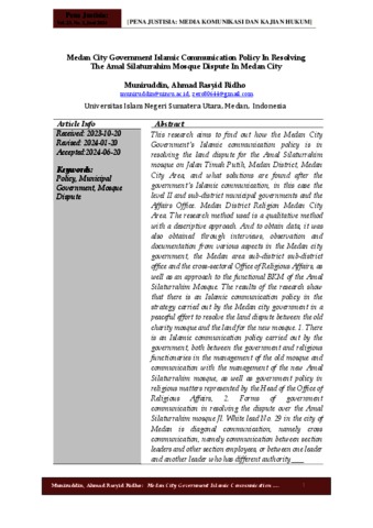 Muniruddin, Muniruddin and Ridho, Ahmad Rasyid (2024) Medan City Government Islamic Communication Policy In Resolving The Amal Silaturrahim Mosque Dispute In Medan City. Pena Justisia: Media Komunikasi Dan Kajian Hukum, 23 (2).