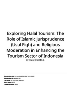 Khoiri, Nispul and Siregar, Muhammad Habibi and Muniruddin, Muniruddin (2024) Turnitin Exploring Halal Tourism : The Role of Islamic Jurisprudence (Usul Fiqh) and Religious Moderation in Enhancing the Tourism Sector of Indonesia. Universitas Islam Negeri Sumatera Utara.