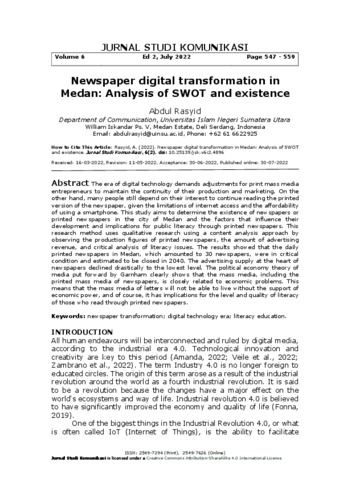 Rasyid, Abdul (2022) Newspaper Digital Transformation in Medan : Analysis of SWOT and Existence. Jurnal Studi Komunikasi, 6 (2). pp. 547-559. ISSN 2549-7294 (Print), 2549-7626 (Online)