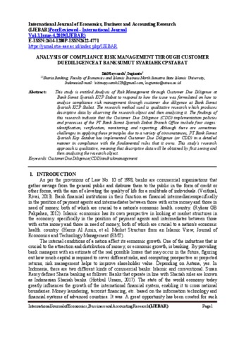 Maysaroh, Siti and Sugianto, Sugianto (2019) ANALYSISOFCOMPLIANCERISKMANAGEMENTTHROUGHCUSTOMER DUEDILIGENCEATBANKSUMUTSYARIAHKCPSTABAT. International Journal of Economics, Business and Accounting Research (IJEBAR), 03 (04). pp. 1-9. ISSN ISSN:2614-1280