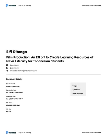 Bahri, Andini Nur and Sazali, Hasan and Ritonga, Elfi Yanti and Simamora, Irma Yusriani Film Production: An Effort to Create Learning Resources of News Literacy for Indonesian Students. Universitas Islam Negeri Sumatera Utara.