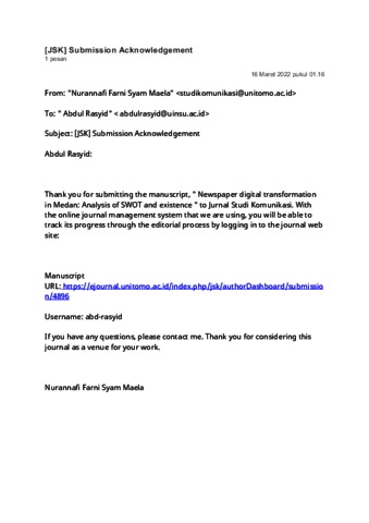Rasyid, Abdul (2022) Bukti Korespondensi Artikel: Newspaper Digital Transformation in Medan : Analysis of SWOT and Existence. Universitas Islam Negeri Sumatera Utara.