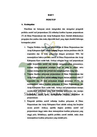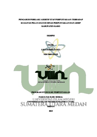 Skripsi ini membahas tentang Perilaku Asertif Staf Perpustakaan terhadap Kualitas Pelayanan di dinas perpustakaan dan arsip Kabupaten Karo. Adapun tujuan yang ingin dicapai dari penelitian ini adalah untuk melihat pengaruh perilaku asertif staf perpustakaan terhadap kualitas pelayanan di dinas perpustakaan dan arsip Kabupaten Karo. Penelitian ini menggunakan metode kuantitatif dengan pendekatan kausal komparatif. Dengan menggunakan teknik pengumpulan data yaitu melalui kuesioner dan dokumentasi. Informan pada penelitian ini yaitu staf perpustakaan yang ada di dinas perpustakaan dan arsip Kabupaten Karo. Hasil penelitian menunjukkan bahwa perilaku asertif staf perpustakaan berpengaruh positif terhadap kualitas pelayanan. Hal tersebut dapat dibuktikan dengan perilaku asertif (X) terhadap kualitas pelayanan (Y) dengan nilai signifikan 0,000 > 0,05 maka Ha diterima dan H0 ditolak. Perilaku asertif memiliki proporsi pengaruh terhadap kualitas pelayanan sebesar 51,7% sedangkan sisanya 48,9% dipengaruhi oleh variabel lain.