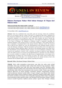 Bin Shaharuddin, Muhammad Hatim (2023) Hukum Penetapan Mahar Oleh Sultan Selangor di Tinjau dari Hukum Islam. Unes Law Review, 6 (2). pp. 7693-7702. ISSN 2622-7045
