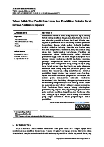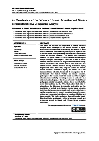 Farabi, Mohammad Al and Hasibuan, Fachri Husaini and Maulana, Ahmad and Sya’i, Ahmad Rasyid As (2023) An Examination of the Values of Islamic Education and Western Secular Education: A Comparative Analysis. Al-Ishlah: Jurnal Pendidikan, 15 (2). pp. 1789-1800. ISSN ISSN: 2087-9490 EISSN: 2597-940X