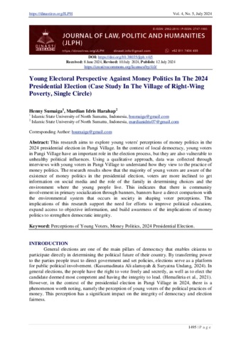 Sumaiga, Henny and Harahap, Mardian Idris (2024) Young Electoral Perspective Against Money Politics In The 2024 Presidential Election (Case Study In The Village of Right-Wing Poverty, Single Circle). Journal of Law, Politic and Humanities (JLPH), 4 (5). pp. 1495-1502. ISSN 2962-2816