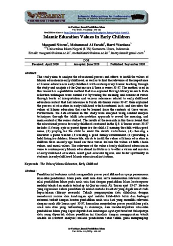 Sitorus, Masganti and Farabi, Mohammad Al and Wardana, Harri (2022) Islamic Education Values In Early Children. At-Tarbiyat: Jurnal Pendidikan Islam, 5 (1). pp. 103-112. ISSN 2655-2736