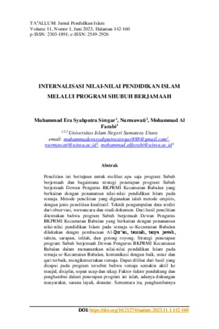 Siregar, Muhammad Era Syahputra and Nurmawati, Nurmawati and Farabi, Mohammad A (2023) Internalisasi Nilai-Nilai Pendidikan Islam Melalui Program Shubuh Berjamaah. TA’ALLUM: Jurnal Pendidikan Islam, 11 (1). pp. 142-160. ISSN p-ISSN: 2303-1891; e-ISSN: 2549-2926