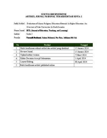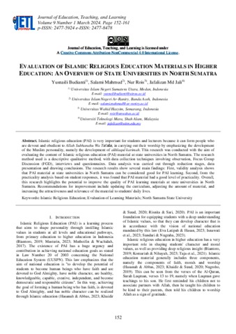 Budianti, Yusnaili and Mahmud, Salami and Rois, Nur and Jali, Jafalizan Md (2024) Evaluation Of Islamic Religious Education Materials In Higher Education: An Overview Of State Universities In North Sumatra. Journal of Education, Teaching, and Learning, 9 (1). pp. 152-161. ISSN p-ISSN: 2477-5924 e-ISSN: 2477-8478