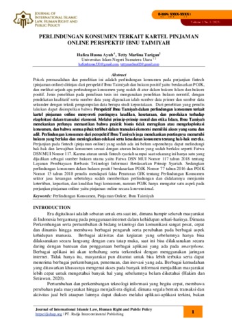 Ayub, Hafiza Husna and Tarigan, Tetty Marlina (2024) PERLINDUNGAN KONSUMEN TERKAIT KARTEL PINJAMAN ONLINE PERSPEKTIF IBNU TAIMIYAH. Journal of International Islamic Law, Human Right and Public Policy, 2 (1). pp. 65-73. ISSN 3031-2280