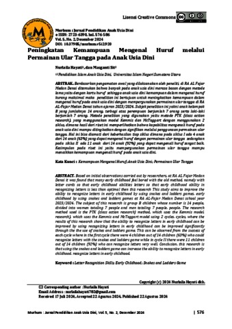 Based on initial observations carried out by researchers, at RA AL Fajar Medan Denai it was found that many early childhood feel bored with the old method, namely with letter cards so that early childhood abilities letters so that early childhood ability in recognizing letters is less than optimal then this research This study aims to improve the ability to recognize letters in early childhood by using snakes and ladders games. early childhood by using snakes and ladders games at RA AL-Fajar Medan Denai school year 2023/2024. The subject of this research is group B children whose number is 14 people, divided into women totaling 7 people and men totaling 7 people. people. The research method used is the PTK (class action research) method, which uses the Kemmis model. research), which uses the Kemmis and McTaggart model using 2 cycles. cycles, where the results of this research show that the ability to recognize letters in early childhood can be improved by using recognizing letters in early childhood can be improved significantly through the the use of snakes and ladders game. This can be observed from the success of each cycle where in the first cycle there were 4 children out of 14 children (63%) who could recognize letters with the snakes and ladders game while in cycle II there were 11 children out of 14 children (92%) who can recognize letters very well. Conclusion. this research is that using the snakes and ladders game can increase the ability to recognize letters in early childhood. recognize letters in early childhood.