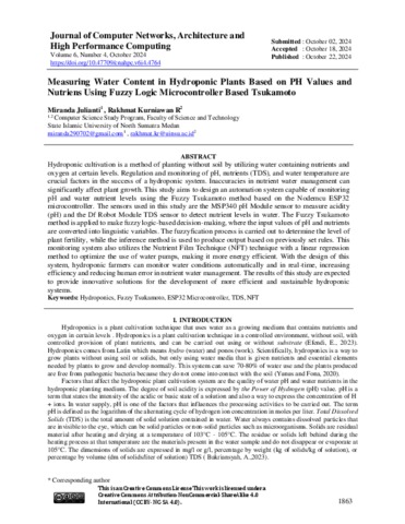 Julianti, Miranda and Kurniawan R, Rakhmat (2024) Measuring Water Content in Hydroponic Plants Based on PH Values and Nutriens Using Fuzzy Logic Microcontroller Based Tsukamoto. Journal of Computer Networks, Architecture and High Performance Computing, 6 (4). pp. 1863-1874. ISSN 2655-9102