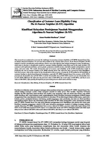 | Uncontrolled Keywords: | Classification, Data Mining, K-Nearest Neighbor, PT. BPRS Amanah Insan Cita |