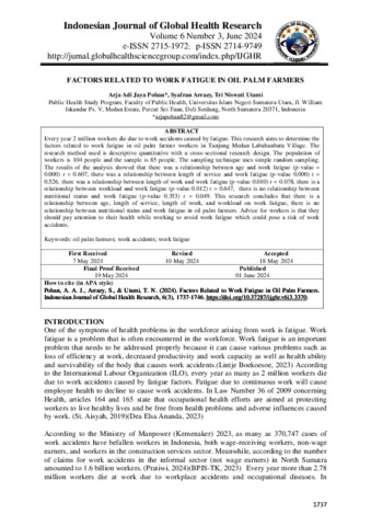 Pohan, Arja Adi Jaya and Arrazy, Syafran and Utami, Tri Niswati (2024) FACTORS RELATED TO WORK FATIGUE IN OIL PALM FARMERS. Indonesian Journal of Global Health Research, 6 (3). pp. 1737-1746. ISSN e-ISSN 2715-1972; p-ISSN 2714-9749