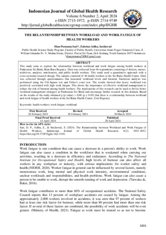 Sari, Dian Purnama and Aidha, Zuhrina and Susilawati, Susilawati (2024) THE RELANTIONSHIP BETWEEN WORKLOAD AND WORK FATIGUE OF HEALTH WORKERS. Indonesian Journal of Global Health Research, 6 (2). pp. 1031-1041. ISSN e-ISSN 2715-1972; p-ISSN 2714-9749