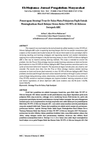 Arlina, Arlina and Maharani, Alya Wira (2024) Penerapan Strategi True Or False Mata Pelajaran Fiqih Untuk Meningkatkan Hasil Belajar Siswa Kelas VII MTs Al-Ikhwan Serapuh ABC. El-Mujtama: Jurnal Pengabdian Masyarakat, 4 (2). pp. 945-952. ISSN P-ISSN 2746-9794 E-ISSN 2747-2736