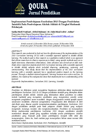 Wardani, Sarika Herfi and Rahman, Abdul and Lubis, M. Zukri Rizal and Arlina, Arlina (2024) Implementasi Pembelajaran Kurikulum 2013 Dengan Pendekatan Saintifik Pada Pembelajaran Akidah Akhlak di Tingkat Madrasah Ibtidaiyah. Qouba: Jurnal Pendidikan, 1 (2).