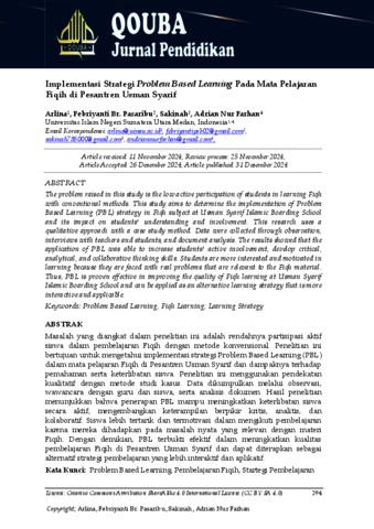 Arlina, Arlina and Pasaribu, Febriyanti Br. and Sakinah, Sakinah and Farhan, Adrian Nur (2024) Implementasi Strategi Problem Based Learning Pada Mata Pelajaran Fiqih di Pesantren Usman Syarif. QOUBA : Jurnal Pendidikan, 1 (2).