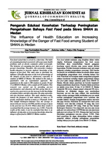 Fast food adalah makanan yang disajikan dalam waktu singkat. Kebiasaan mengonsumsi fast food secara berlebihan akan menyebabkan banyak gangguan kesehatan seperti obesitas atau secara umum disebut kegemukan. Perilaku konsumsi makanan cepat saji sangat pengaruh terhadap pengetahuan seseorang. Oleh karena itu peneliti ini melakukan edukasi kesehatan dalam upaya meningkatkan pengetahuan siswi terhadap bahaya fast food. Penelitian ini bertujuan untuk mengetahui pengaruh edukasi kesehatan terhadap tingkat pengetahuan bahaya fast food pada remaja terkhusus pada siswa SMAN 21 Medan. Metode dalam penelitian ini bersifat kuantitatif dengan pendekatan eksperimen. Populasi dalam penelitian ini adalah siswa kelas 10 dan 11 di SMAN 21 Medan berjumlah 586 siswa, dengan sampel sebanyak 238 siswa. Penelitian ini dilakukan dengan cara memberikan kuesioner pre-test dan juga edukasi lalu memberikan waktu selama seminggu untuk melakukan post-test untuk melihat peningkatan pengetahuan siswi sesbelum dan sesudah edukasi. Dengan menggunakan analisis univariat dan juga bivariat. Penelitian ini memperoleh hasil yaitu frekuensi siswi laki-laki sebanyak 79 orang dan siswi perempuan sebanyak 159 orang. Pada uji One Sample Kolmogrov-Smirmov Test diperoleh rata-rata atau mean pada pre-test yaitu sebesar 14.9790 dan rata-rata atau mean pada post-test sebesar 18.3151. Dimana dari hasil tersebut ditemukan peningkatan rata-rata sebesar 3.3361. Pada hasil penelitian ini dapat disimpulkan bahwa terdapat pengaruh edukasi terhadap peningkatan pengetahuan tentang bahaya fast food pada siswa SMAN 21 Medan.