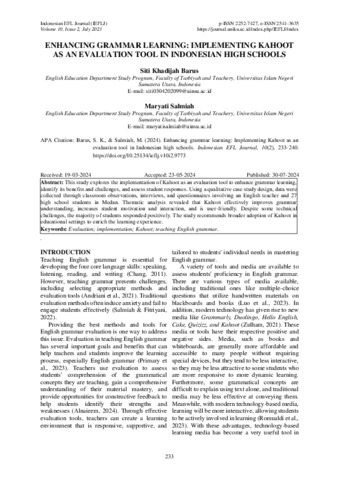 Barus, Siti Khadijah (2023) Enhancing Grammar Learning: Implementing Kahoot As An Evaluation Tool In Indonesian High Schools. Indonesian EFL Journal (IEFLJ).