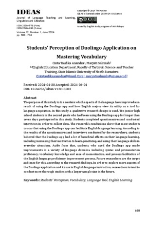 Anandra, Cinta Taufika Students’ Perception of Duolingo Application on Mastering Vocabulary. IDEAS Journal of Language Teaching and Learning, Linguistics and Literature.