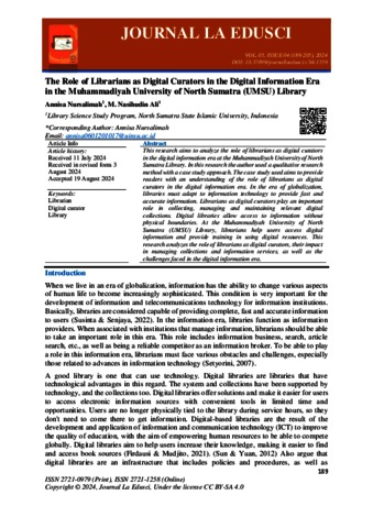 Nursalimah, Annisa (2024) The Role of Librarians as Digital Curators in the Digital Information Era in the Muhammadiyah University of North Sumatra (UMSU) Library. JOURNAL LA EDUSCI.