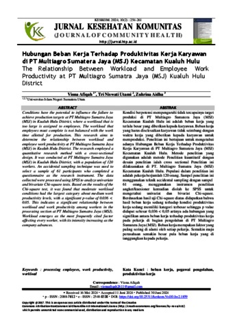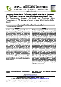 Kondisi berpotensi mempengaruhitidak tercapainya target produksi di PT Multiagro Sumatera Jaya (MSJ) Kecamatan Kualuh Hulu ini adalah beban kerja yang terlalu besar yang diberikan kepada karyawan. Beban kerja yang harus diselesaikan karyawan tidak seimbang dengan waktu kerja yang diberikan kepada karyawan untuk memproduksi. Penelitian ini bertujuan untuk mengetahui adanya Hubungan Beban Kerja Terhadap Produktivitas Kerja Karyawan di PT Multiagro Sumatera Jaya (MSJ) Kecamatan Kualuh Hulu. Metode penelitian yang digunakan adalah metode Penelitian kuantitatif dengan desain penelitian ialah cross sectional Penelitian ini dilaksanakan di PT. Multiagro Sumatra Jaya (MSJ) Kecamatan Kualuh Hulu. Populasi dalam penelitian ini adalah pekerja berjumlah 120 orang. Sampel penelitian ini menggunakan teknik accidental sampling dengan sampel 61 orang, menggunakan instrumen penelitian angket/kuesioner kemudian diolah ke SPSS untuk mengetahui univariat dan bivariat Chi-square. Berdasarkan hasil uji Chi-square diatas didapatkan bahwa hasil beban kerja sedang terhadap kondisi produktivitas kerja sedang memiliki kategori terbesar sehingga p value didapat sebesar 0,036 < 0,05 artinya ada hubungan yang signifikan antara beban kerja terhadap produktivitas kerja pada pekerja di bagian pengolahan di PT Multiagro Sumatera Jaya (MSJ). Beban kerja merupakan faktor yang paling sering di alami oleh setiap pekerja. Semakin maju perusahaan semakin besar pula beban kerja yang di tanggungkan kepada pekerja.