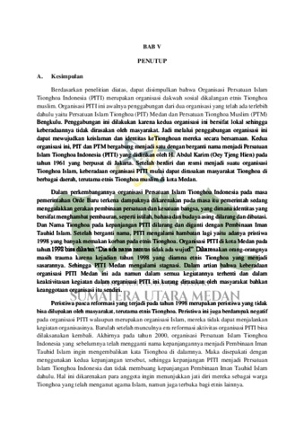Skripsi ini mengkaji tentang Peran Organisasi Persatuan Islam Tionghoa Indonesia (PITI) dalam Perkembangan Muslim Tionghoa di Kota Medan, Tahun 1998-2023. Adapun tujuan penelitian ini yaitu untuk mengetahui bagaimana Sejarah, perkembangan serta peran organisasi Persatuan Islam Tionghoa Indonesia di Kota Medan, tahun 1998-2023. Penelitian ini menggunakan jenis penelitian kualitatif dengan metode sejarah yang melalui empat tahapan yaitu heuristik (pengumpulan sumber), verifikasi (kritik sumber), interpretasi (penafsiran), dan histografi (penulisan). Dalam teknik pengumpulan data menggunakan tiga teknik yaitu observasi, wawancara dan dokumentasi. Dari hasil penelitian menunjukkan bahwa Organisasi Persatuan Islam Tionghoa (PITI) merupakan organisasi dakwah sosial yang menaungi etnis Tionghoa muslim di kota Medan yang didirikan pada tahun 1961. Dalam perkembangan keorganisasiannya mengalami hambatan seperti masa orde baru yang harus mengganti nama kepanjangan organisasinya. Dan pada tahun 1998, PITI Medan bisa dikatakan “Dia ada nama namun tidak ada wujud”, dalam artian keberadaan organisasi PITI Medan ini ada tetapi dalam semua kegiatannya mengalami stagnasi. Namun dalam menjalankan sebuah organisasi, bukan berarti tidak memenuhi halangan. Sekarang PITI Medan banyak mengalami penurunan keaktifan organisasinya disebabkan kurangnya kesadaran para pengurus dan anggota untuk memajukan organisasi tersebut. Dikarenakan pekerjaan dan jarak yang cukup jauh serta kurangnya dana juga menjadi penghambat perkembangan organisasi PITI Medan. Selain itu dikarenakan adanya pandemi covid-19 juga mengakibatkan tidak adanya kegiatan-kegiatan yang dilakukan oleh organisasi PITI Medan ini hingga sampai sekarang. Organisasi PITI memiliki peran sebagai wadah untuk membina keagamaan dan mempersatukan muslim Tionghoa dengan muslim pribumi, dan muslim pribumi dengan etnis Tionghoa yang menjadi salah satu perkembangan muslim Tionghoa di kota Medan yang diwujudkan melalui program-program kegiatan, seperti pengajian, majlis taklim muslimat, kegiatan pada bulan Ramadhan, serta kegiatan memperingati hari besar Islam.