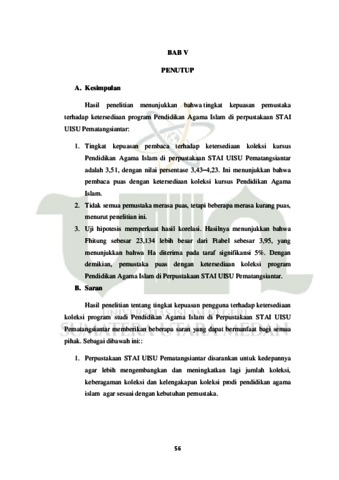 Penelitian ini membahas tentang “Tingkat Kepuasan Pemustaka Terhadap Ketersediaan Koleksi Prodi Pendidikan Agama Islam di Perpustakaan Sekolah Tinggi Agama Islam Universitas Islam Sumatera Utara (STAI UISU) Pematangsiantar”. Tujuan penelitian ini adalah untuk mengetahui apakah terdapat kepuasan pemustaka terhadap ketersediaan koleksi Prodi Pendidikan Agama Islam di perpustakaan STAI UISU Pematangsiantar dan untuk mengetahui seberapa besar kepuasan pemustaka terhadap ketersediaan koleksi prodi Pendidikan Agama Islam di Perpustakaan STAI UISU Pematangsiantar. Metode yang digunakan pada penelitian ini adalah penelitian deskriptif dengan pendekatan kuantitatif. Jumlah populasi dalam penelitian ini adalah mahasiswa/i aktif prodi Pendidikan Agama Islam STAI UISU Pematangsiantar yang berjumlah 485 orang dengan penarikan sampel menggunakan teknik Probability Sampling dengan jumlah sampel sebesar 87 orang. Teknik pengumpulan data menggunakan angket. Teknik analisis data menggunakan metode persentase data. Berdasarkan hasil analisis data, hasil menunjukkan bahwa kepuasan pemustaka terhadap ketersediaan koleksi prodi Pendidikan Agama Islam di Perpustakaan STAI UISU Pematangsiantar berada pada skor 3,51 skor ini berada pada skala interval 2,62 – 3,42 yang berarti tingkat kepuasan pemustaka terhadap ketersediaan koleksi prodi Pendidikan Agama Islam di Perpustakaan STAI UISU Pematangsiantar adalah puas.
