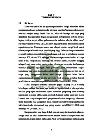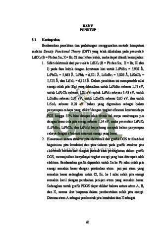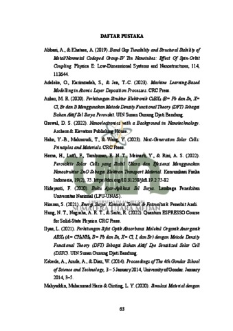 Sel surya perovskite adalah jenis sel surya yang menggunakan perovskite sebagai bahan aktif untuk menangkap dan mengonversi sinar matahari menjadi listrik. Perovskite adalah senyawa yang memiliki struktur kristal khas dengan formula umum ABX₃, di mana A dan B adalah kation berbeda, dan X adalah anion, biasanya halida (seperti klorida, bromida, atau iodida). Penelitian mengenai perovskite terus berlanjut untuk menemukan jenis perovskite dengan efisiensi tinggi. Efisiensi yang tinggi berkaitan dengan struktur elektronik sebagai bahan aktif. Struktur elektronik dapat dianalisis menggunakan metode komputasi melalui Density Functional Theory (DFT). Pada penelitian ini, perovskite yang diuji adalah perovskite LiBX3 (B = Pb dan Sn; X = Br, Cl dan I) fase kubik. Selain itu, perhitungan dilakukan menggunakan perangkat lunak Quantum ESPRESSO dengan memodifikasi berbagai parameter seperti energi cut-off, k-point, dan konstanta kisi. Dari hasil optimasi perhitungan pada keenam perovskite tersebut, diperoleh nilai band gap, DOS dan PDOS pada perovskite LiBX3 (B = Pb dan Sn; X = Br, Cl dan I). Nilai energi celah pita (Eg) yang dihasilkan untuk LiPbBr3 sebesar 1,71 eV, untuk LiPbCl3 sebesar 1.87 eV, untuk LiPbI3 sebesar 1.43 eV, untuk LiSnBr3 sebesar 0.51 eV, untuk LiSnCl3 sebesar 0.65 eV, dan untuk LiSnI3 sebesar 0.28 eV. Dan penelitian ini menyatakan nilai celah pita energi semakin besar dengan perubahan jari-jari atom yang semakin besar dari Sn ke Pb dan nilai celah pita energi semakin kecil dengan perubahan jari-jari atom yang semakin besar dari Cl, Br ke I. Perhitungan struktur elektronik dari LiBX3 (B = Pb dan Sn; X = Br, Cl dan I) menunjukkan sifat bahan semikonduktor, dan berpotensi digunakan sebagai bahan penyerapan cahaya pada sel surya perovskite. Kata kunci: Perovskite, DFT, Quantum ESPRESSO, Celah Pita Energi