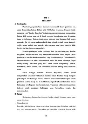Skripsi ini berjudul KONSEP HALALAN THAYYIBAN TERHADAP KEHIDUPAN MANUSIA DALAM TAFSIR AL-MISBAH, yang membahas tentang apa makna halalan thayyiban menurut para Ulama‟, dan khususnya menurut kitab tafsir al-misbah, dan penelitian ini diteliti dengan penelitian perpustakaan (Library research) dengan mengumpulkan data yang berkaitan dengan penelitian ini, kemudian diuraikan berdasarkan data yang diperoleh. Teknik pengumpulan data yang digunakan dengan cara mengumpulkan buku, kitab, dan artikel terkait. Dalam penelitian ini yang menjadi rumusan masalah ialah: Apa itu makanan dan minuman Halalan Thayyiban menurut perspektif kitab tafsir Al-Misbah, Bagaimana Pandangan Medis tentang Halalan Thayyiban, Apa pengaruh Halalan Thayyiban terhadap kehidupan manusia dalam kajian kitab tafsir al-Misbah dan Bagaimana upaya Menjaga Halalan Thayyiban. Adapun hasil dari penelitian ini adalah, Dari berbagai penjelasan dalam setiap pembahasan pada setiap bab penelitian ini, serta berdasarkan dari rumusan masalah yang ada, maka dapat diambil sebuah kesimpulan yaitu: Dalam tafsir AlMisbah penjelasan Quraish Shihab mengenai ayat Halalan Thayyiban tema makanan dan minuman yang tergabung dalam satu ayat ditemukan empat ayat hampir sama, bahwa tidak semua yang ada di bumi lantas otomatis bisa dimakan atau digunakan begitu saja, bahwa tidak semua makanan yang halal otomatis baik. Karena yang dinilai halal terdiri dari empat macam, yaitu: wajib, sunah, mubah, dan makruh. Ada makanan yang halal, tetapi tidak bergizi, dan ketika itu ia menjadi hal yang kurang baik.