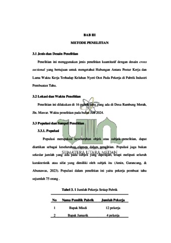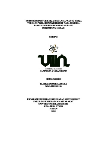 Endah Masyura, Elvira (2024) Hubungan Postur Kerja Dan Lama Waktu Kerja Terhadap Keluhan Nyeri Otot Pada Pekerja Pabrik Industri Pembuatan Tahu Di Rambung Merah. Skripsi thesis, UIN Surmatra Utara Medan.