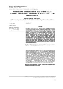 Pemanfaatan Artificial Intelligence (AI) dalam bidang pendidikan memudahkan mahasiswa dalam penyelesaian tugas. Penelitian ini bertujuan untuk mengetahui persepsi mahasiswa jurusan ilmu perpustakaan UIN Sumatera Utara terhadap penggunaan Artificial Intelligence (AI) dalam membantu penulisan karya ilmiah. Penelitian ini menggunakan metode kualitatif dengan pengambilan sampel menggunakan teknik purposive dan snowball. Teknik pengumpulan data dilakukan melalui observasi, wawancara dan dokumentasi. Analisis data dilakukan menggunakan software NVivo dan dilakukan triangulasi untuk memastikan validitas dan kredibilitas temuan penelitian. Hasil penelitian menunjukkan bahwa mahasiswa memiliki persepsi positif terhadap penggunaan Artificial Intelligence (AI) dalam komunikasi ilmiah. Artificial Intelligence (AI) dianggap cukup relevan untuk dijadikan acuan dalam mencari referensi pada penulisan karya ilmiah. Namun, tidak sedikit dari mahasiswa yang kurang ahli dalam menganalisis platform kecerdasan buatan yang relevan dan lebih valid dalam memberikan informasi.