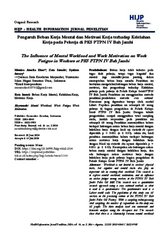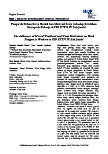 iBeban ikerja itidak iterbatas ipada tugas ifisik ipekerja, itetapi itugas ikognitif idan mental ijuga memilikiiperan penting dalam menciptakan ibeban ikerja imereka. Penelitian iini bertujuanimengetahui hubunganibeban ikerja imental, motivasi, idan ipengaruhnya iterhadap iKelelahan pekerja ipada ipekerja idi iPabrik iKelapa iSawit PTPN IV iBah iJambi. Penelitian iini imenggunakan imetode penelitianipendekatan metode cross isectional. Kuesioner iyang idigunakan iberupa iskala imodel Likert. iPopulasi ipenelitian iini isebanyak i68 iorang pekerja idi ibagian ipengolahan idi iPabrik iKelapa Sawit iPTPN iIV iBah iJambi. iDengan iteknik pengambilan isampel imenggunkan itotal isampling maka, ijumlah iresponden ipada ipenelitian iini sebanyak i68 iorang. Penelitian imenunjukkan ibahwa terdapat hubunganiantara beban kerja mental dengan kelelahan kerja dengan hasil uji statistikichi square diperoleh ip i= i0.001 i(α i≤ i0.05). iselain iitu, ihasil peneltian imenunjukkan ibahwa iterdapat ihubungan antara imotivasi ikerja idengan ikelelahan ikerja dengan iHasil iuji istatistik ichi isquare idiperoleh ip i= 0.003 i(α i≤ i0.05). Kesimpulan ada hubungan antara beban imerja imental idengan ikelelahan ikerja, idan ada ihubungan iantara imotivasi ikerja idengan kelelahan ikerja ipada ipekerja ibagian ipengolahan idi Pabrik iKelapa iSawit iPTPN iIV iBah iJambi.