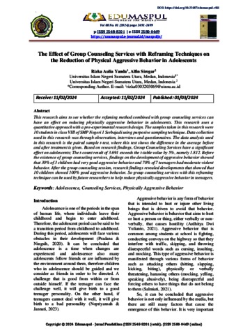 Yanda, Rizka Aulia (2024) The Effect of Group Counseling Services with Reframing Techniques on the Reduction of Physical Aggressive Behavior in Adolescents. Edumaspul: Jurnal Pendidikan, 8 (1).