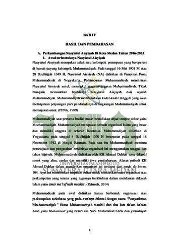 Dalam penelitian skripsi ini ada dua fokus permasalahan, yaitu bagaimana perkembangan Nasyiatul Aisyiyah di Kota Medan tahun 2016-2023 dan apa saja program kerja yang dijalankan Nasyiatul Aisyiyah di Kota Medan tahun 2016- 2023. Penelitian ini bertujuan untuk mengetahui perkembangan Nasyiatul Aisyiyah di Kota Medan tahun 2016-2023 dan program kerja yang dijalankan Nasyiatul Aisyiyah di Kota Medan tahun 2016-2023. Heuristik, verifikasi, interpretasi, dan historiografi adalah empat langkah metode penelitian sejarah yang digunakan dalam karya ini. Melalui observasi, wawancara, dan dokumentasi, data dikumpulkan. Kerja lapangan langsung di lokasi studi, seperti kantor Pimpinan Daerah Muhammadiyah (PDM) di Kota Medan, digunakan untuk mengumpulkan data. Hasil yang diperoleh dalam penelitian skripsi ini ialah Perkembangan Nasyiatul Aisyiyah (NA) di Kota Medan dari tahun 2016-2023 mengalami banyak peningkatan dan sudah signifikan. Hal ini dibuktikan dengan banyaknya kegiatankegiatan yang dilakukan setiap bulan bahkan setiap tahunnya. Namun, ada beberapa kendala yang dialami Nasyiatul Aisyiyah, seperti saat merebaknya pandemi virus COVID-19 di Kota Medan yang terjadi sekitar tahun 2020 sampai 2021 pertengahan, beberapa kegiatan terpaksa rehat sementara. Akan tetapi, Nasyiatul Aisyiyah tetap membantu masyarakat yang terkena musibah dengan melakukan donasi dan penggalangan dana serta membagikan masker. Pada tahun 2022-2023 Nasyiatul Aisyiyah kembali menjalankan program-programnya. Beberapa program baru juga sudah dijalankan 2 tahun belakangan ini. Sehingga Nasyiatul Aisyiyah sekarang ini masih menjalankan proses perkembangan yang jauh lebih pesat daripada tahun-tahun sebelumnya. Adapun Program unggulan yang telah dilaksanakan Nasyiatul Aisyiyah di kota Medan pada tahun 2016-2023 yaitu parenting class, Nasyiatul Aisyiyah tanggap bencana, pelatihan kepemimpinan, symposium internasional perempuan muda Muhamadiyah, PASHMINA, dan TOT kewirausahaan.