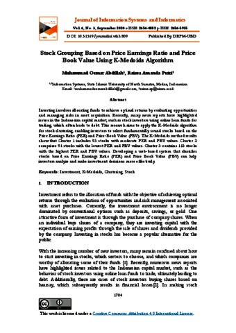 Oemar Abdillah, Muhammad Stock Grouping Based on Price Earnings Ratio and Price Book Value Using K-Medoids Algorithm. Journal of Information Systems and Informatics.