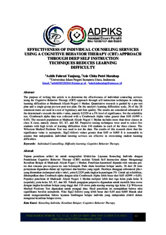 Tanjung, Asbih Fahrezi (2024) Effectiveness Of Individual Counseling Services Using a Cognitive Behavior Therapy (Cbt) Approach Through Deep Self Instruction Techniques Reduces Learning Difficulty. PAEDAGOGIC FORUM, 15 (1).