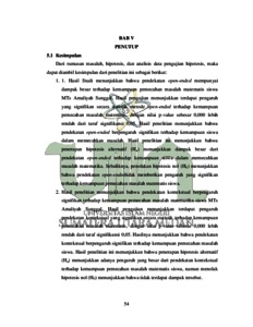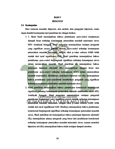 Skripsi ini membahas tentang pengaruh pendekatan open-ended dan pendekatan kontekstualterhadap kemampuan pemecahan masalah matematis siswa yang bertujuan untuk mengetahui apakah terdapat pengaruh pendekatan open-ended dan pendekatan kontekstualterhadap kemampuan pemecahan masalah matematis siswa dikelas VII MTs Amaliyah Sunggal. Penelitian ini merupakan penelitian kuantitatif jenis quasi eksperimen. Populasi penelitian ini adalah seluruh siswa kelas VII MTs Amaliyah Sunggal.Sampel yang diambil adalah dua kelas yang masing-masing berjumlah 38 siswa, yaitu VII-A dan VII-D. Teknik pengambilan sampel yang digunakan adalah cluster random sampling.. Instrumen yang digunakan berupa test, berupa pretest dan posttest. Pengolahan data dilakukan dengan menggunakan aplikasi SPSS. Hasil penelitian menunjukkan bahwa terdapat pengaruh yang signifikan antara pendekatan open-ended dan pendekatan kontekstual terhadap kemampuan pemecahan masalah matematis siswa MTs Amaliyah Sunggal. Hal tersebut ditunjukkan dengan nilai sig. (2-tailed) < 0,05 (0,000 < 0,05) maka H0 ditolak. Hasil penelitian ini menunjukkan bahwa penerapan hipotesis alternatif (Ha) menunjukkan adanya pengaruh dari pendekatan open-ended dan pendekatan kontekstual terhadap kemampuan pemecahan masalah matematis siswa, namun menolak hipotesis nol (H0) menunjukkan bahwa tidak terdapat pengaruh.