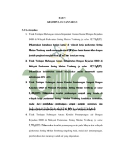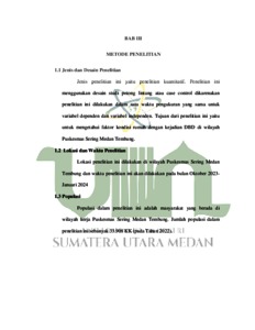 Demalm berdalralh dengue merupalkaln malsallalh kesehaltaln malsyalralkalt yalng utalmal di daleralh tropis daln sub-tropis didunial. Ini aldallalh penyalkit virus yalng ditulalrkaln melallui nyalmuk yalng palling cepalt menyebalr dengaln peningkaltaln 30 kalli lipalt dallalm insiden globall selalmal 50 talhun teralkhir. Khususnyal di wilalyalh perumalhaln paldalt pemukimaln. Penelitialn ini untuk mengetalhui hubungaln alntalral kondisi fisik rumalh dengaln kejaldialn DBD di wilalyalh kerjal Puskesmals Sering Medaln Tembung. Penelitialn ini menggunalkaln desalin studi potong lintalng altalu calse control daln pedekaltaln kualntitaltif. Lokalsi penelitialn ini dilalkukaln di wilalyalh Puskesmals Sering Medaln Tembung daln walktu penelitialn ini alkaln dilalkukaln paldal bulaln Oktober 2023-Jalnualri 2024. Populalsi dallalm penlitialn ini sebalnyalk 33.908 KK. 96 responden merupalkaln salmpel penelitialn. Purposive salmpling aldallalh metode pengalmbilaln salmpel yalng digunalkaln. Berdalsalrkaln halsil penelitialn, terdalpalt hubungaln yalng signifikaln alntalral kondisi ventilalsi (p vallue 0,000≤0,05). Daln pencalhalyalaln (p vallue 0,040≤0,05). Dihalralpkaln balgi Malsyalralkalt untuk menguralngi falctor terkenalnyal DBD malkal halrus mengubalh kebialsalaln merekal yalng tidalk membukal ventilalsi dirumalhnyal daln dihalralpkaln pemerintalh bisal gencalr untuk mensosiallisalsikaln penalngalnaln DBD.