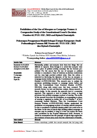 Siregar, Rahmat Insani (2024) Pelarangan Penggunaan Masjid Sebagai Tempat Kampanye: Studi Perbandingan Putusan MK Nomor 65/ PUU-XXI /2023 dan Siyāsah Dusturiyāh. Jurnal MEDIASAS: Media Ilmu Syari’ah dan Ahwal Al-Syakhsiyyah, 7 (1).